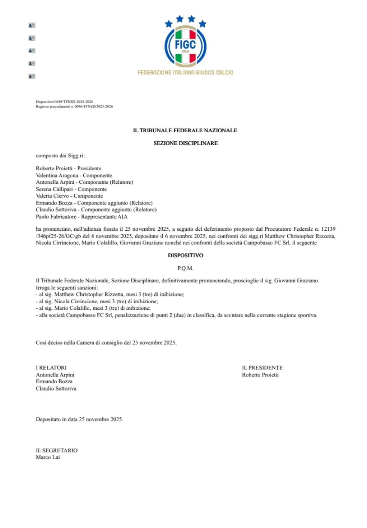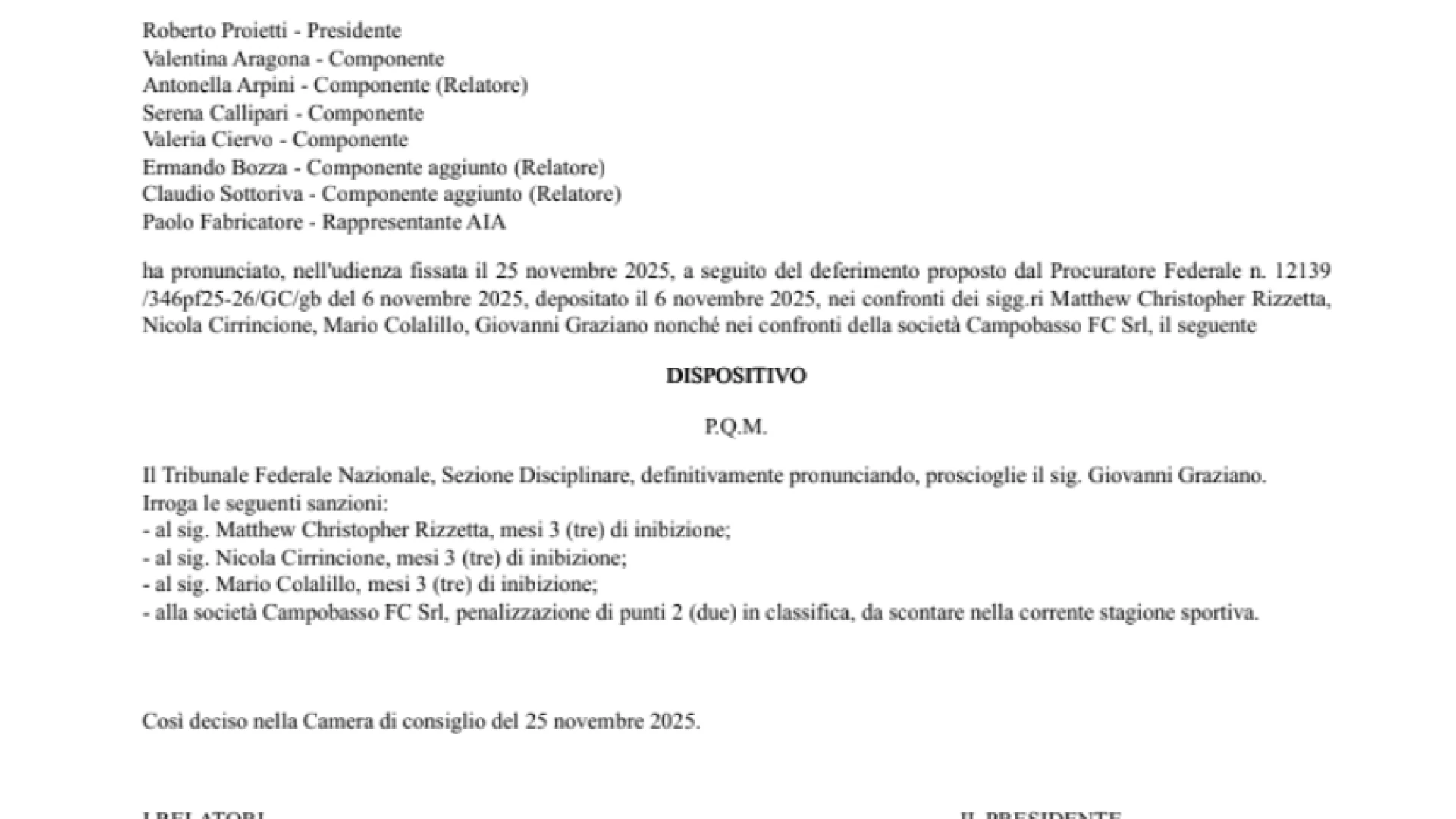 Colpo duro per il Campobasso. Nell’udienza del 25 novembre 2025, il Tribunale Federale Nazionale – Sezione Disciplinare ha deciso di infliggere due punti di penalizzazione al club molisano, che ora dovrà proseguire il proprio cammino nel Girone B di Serie C con un fardello non indifferente. La vicenda nasce dal deferimento dello scorso 6 novembre, scaturito dalle segnalazioni della Commissione Indipendente per la Verifica dell’Equilibrio Economico e Finanziario delle Società Sportive, l’organo che controlla la solidità e la regolarità delle società calcistiche. Le irregolarità contestate, di natura amministrativa, hanno portato la Procura Federale a coinvolgere nel procedimento sia il club sia alcuni dirigenti. Durante la seduta, presieduta da Roberto Proietti e composta dai membri Valentina Aragona, Antonella Arpini (relatore), Serena Callipari, Valeria Ciervo, con il supporto dei componenti aggiunti Ermando Bozza e Claudio Sottoriva (relatori) e del rappresentante AIA Paolo Fabricatore, il Tribunale ha esaminato le posizioni dei quattro deferiti: Matthew Christopher Rizzetta, Nicola Cirrincione, Mario Colalillo e Giovanni Graziano. Al termine della discussione, è arrivato il verdetto: Giovanni Graziano è stato prosciolto, mentre per Rizzetta, Cirrincione e Colalillo sono stati disposti tre mesi di inibizione. Alla società è stata invece inflitta la penalizzazione di 2 punti. Resta da capire ora se la società deciderà di valutare le vie del ricorso o se accetterà la sentenza concentrandosi sul campo.