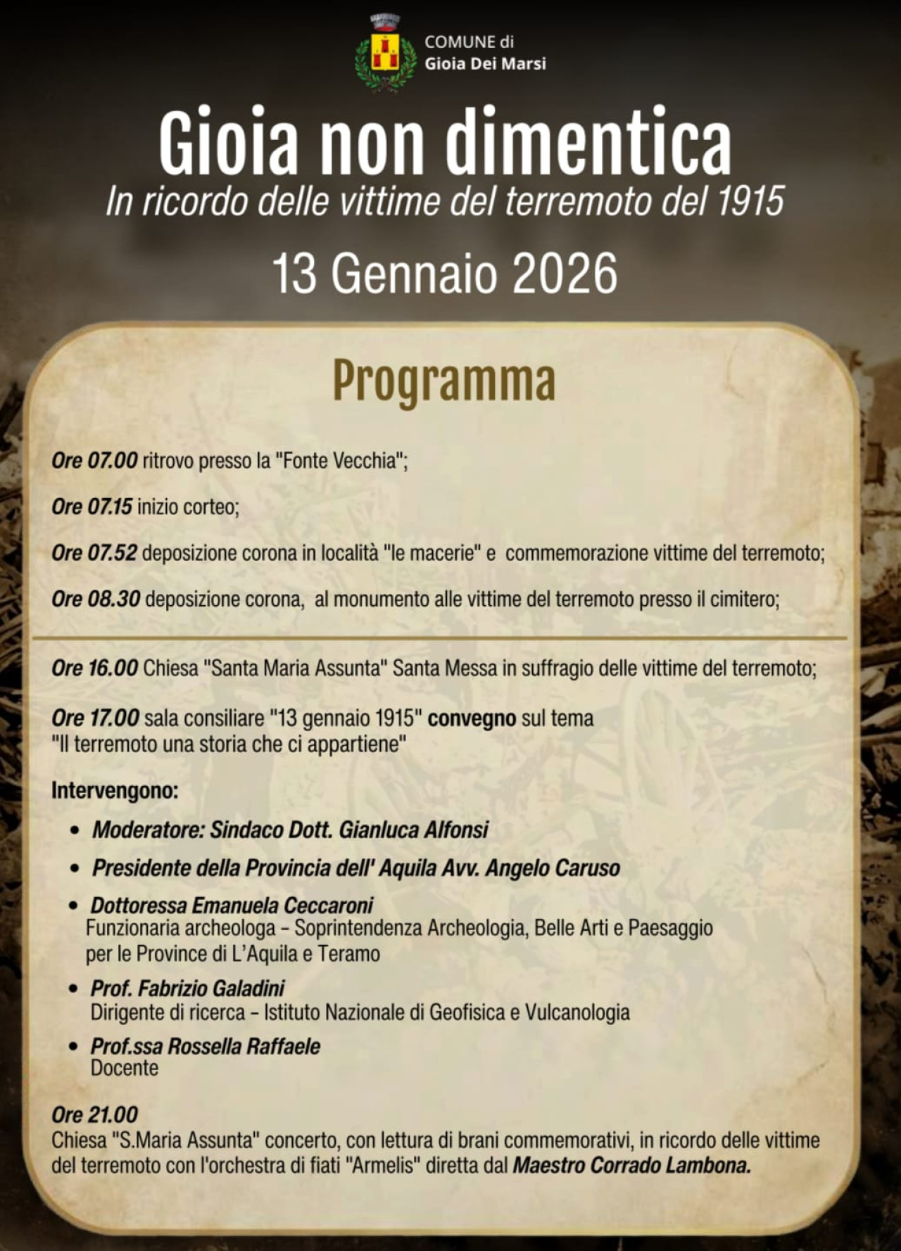 GIOIA DEI MARSI - Il 13 gennaio 1915, alle 7.53, Gioia dei Marsi venne colpita da uno dei più gravi terremoti della storia italiana. A oltre un secolo di distanza, il Comune dedica la giornata di martedì 13 gennaio 2026 alla memoria delle vittime, con un programma che unisce raccoglimento, studio e testimonianza. La commemorazione si aprirà alle 7 con il ritrovo presso la “Fonte Vecchia”, seguito alle 7.15 dall’inizio del corteo. Alle ore 7.52, nel luogo simbolico de “Le Macerie”, sarà deposta una corona in ricordo delle vittime del sisma. La mattinata proseguirà alle ore 8.30 con la deposizione di una corona al monumento alle vittime del terremoto presso il cimitero comunale. Nel pomeriggio, alle 16, nella chiesa di Santa Maria Assunta sarà celebrata la Santa Messa in suffragio delle vittime.