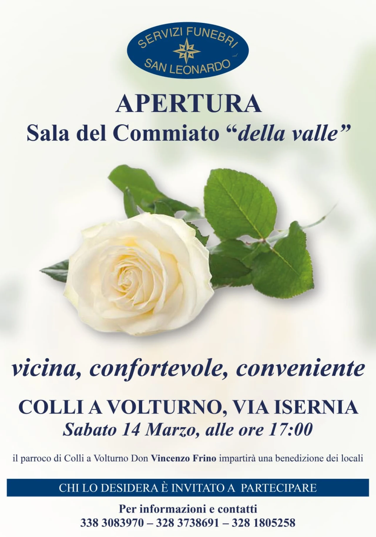 COLLI A VOLTURNO/REDAZIONALE. La società San Leonardo Srl investe sul territorio e soprattutto sui servizi funebri da fornire all’utente finale e ai suoi familiari. Dall’impegno e dall’investimento degli imprenditori Lucio Leva , Marco Piredda e Pina Cipolla responsabile anche della parte floreale, nei prossimi giorni verrà aperta ai fruitori la sala del Commiato “della valle”.
