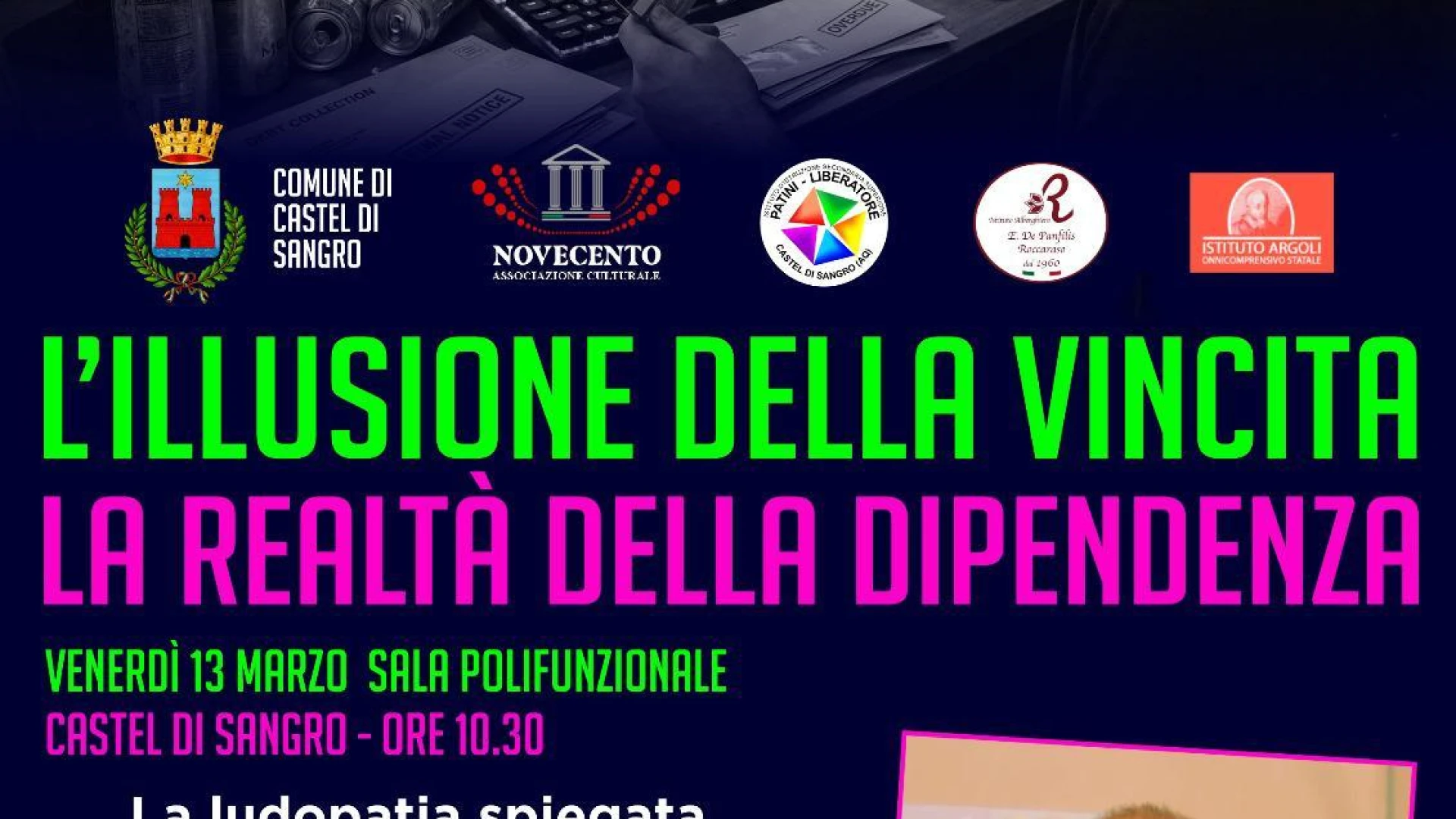 CASTEL DI SANGRO. Domani, Venerdì 13 marzo alle ore 10.30, la sala polifunzionale di Castel di Sangro ospiterà l’incontro dal titolo “L’illusione della vincita, la realtà della dipendenza”, iniziativa culturale inserita all’interno di un calendario più ampio, dedicato agli studenti dell’Istituto Patini-Liberatore De Panfiliis.