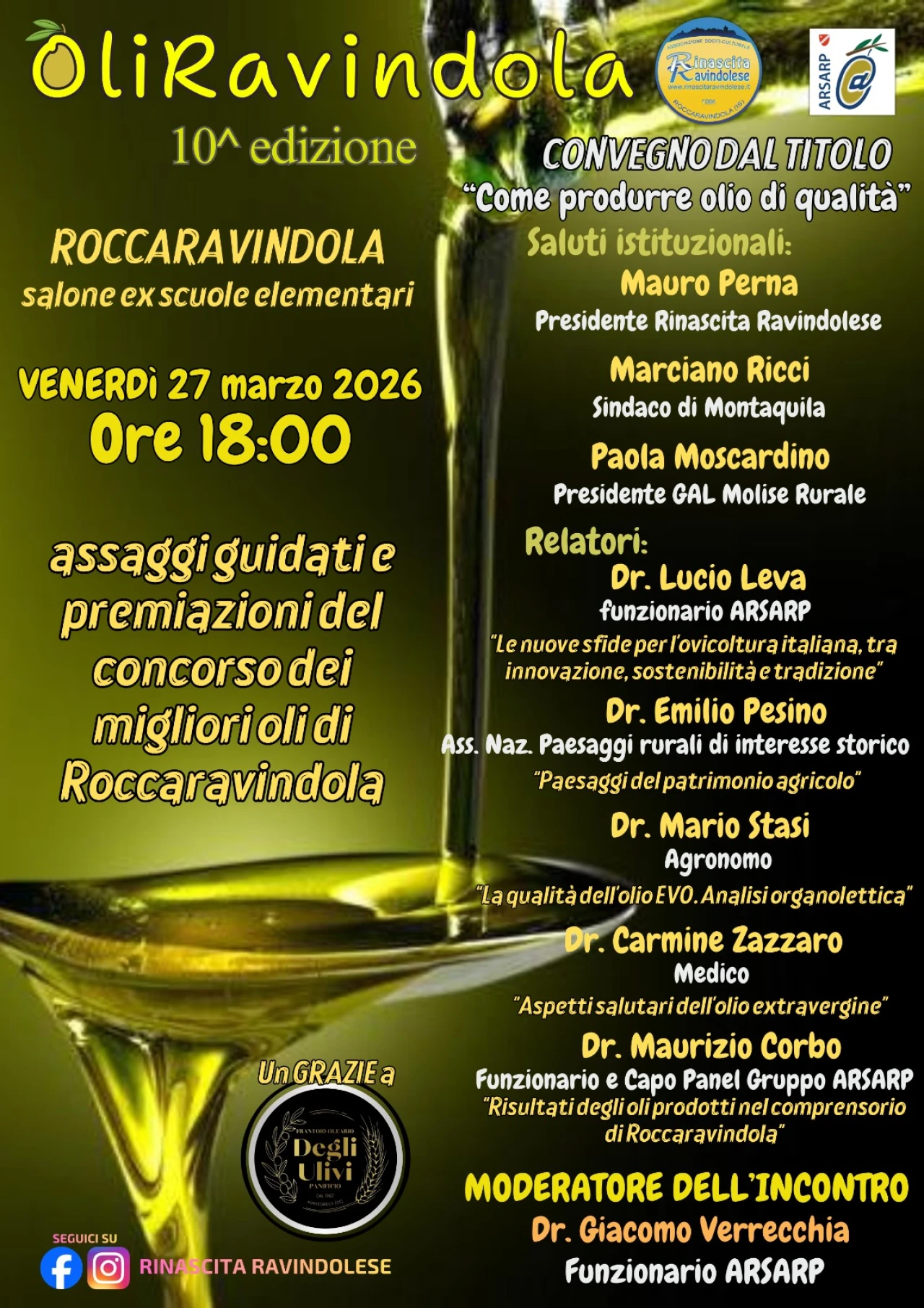 ROCCARAVINDOLA. Il legame profondo tra il territorio molisano e la cultura dell'olivicoltura si rinnova quest'anno con un traguardo speciale: la decima edizione di "OliRavindola", una manifestazione che è ormai diventata un punto di riferimento imprescindibile per i produttori e gli appassionati dell'oro verde. L'appuntamento è fissato per venerdì 27 marzo 2026, a partire dalle ore 18:00, presso il salone delle ex scuole elementari di Roccaravindola, dove la comunità si riunirà per celebrare i frutti del lavoro agricolo e riflettere sul futuro del settore. Il cuore pulsante della serata sarà il convegno tecnico dal titolo "Come produrre olio di qualità", un momento di confronto di alto profilo che vedrà la partecipazione di esperti e rappresentanti istituzionali.