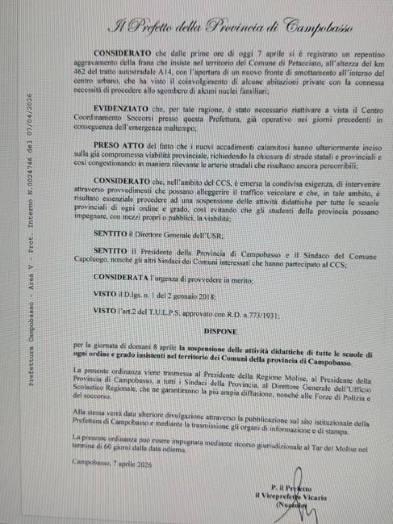 IL DOCUMENTO UFFICIALE DELLA PREFETTURA DI CAMPOBASSO: