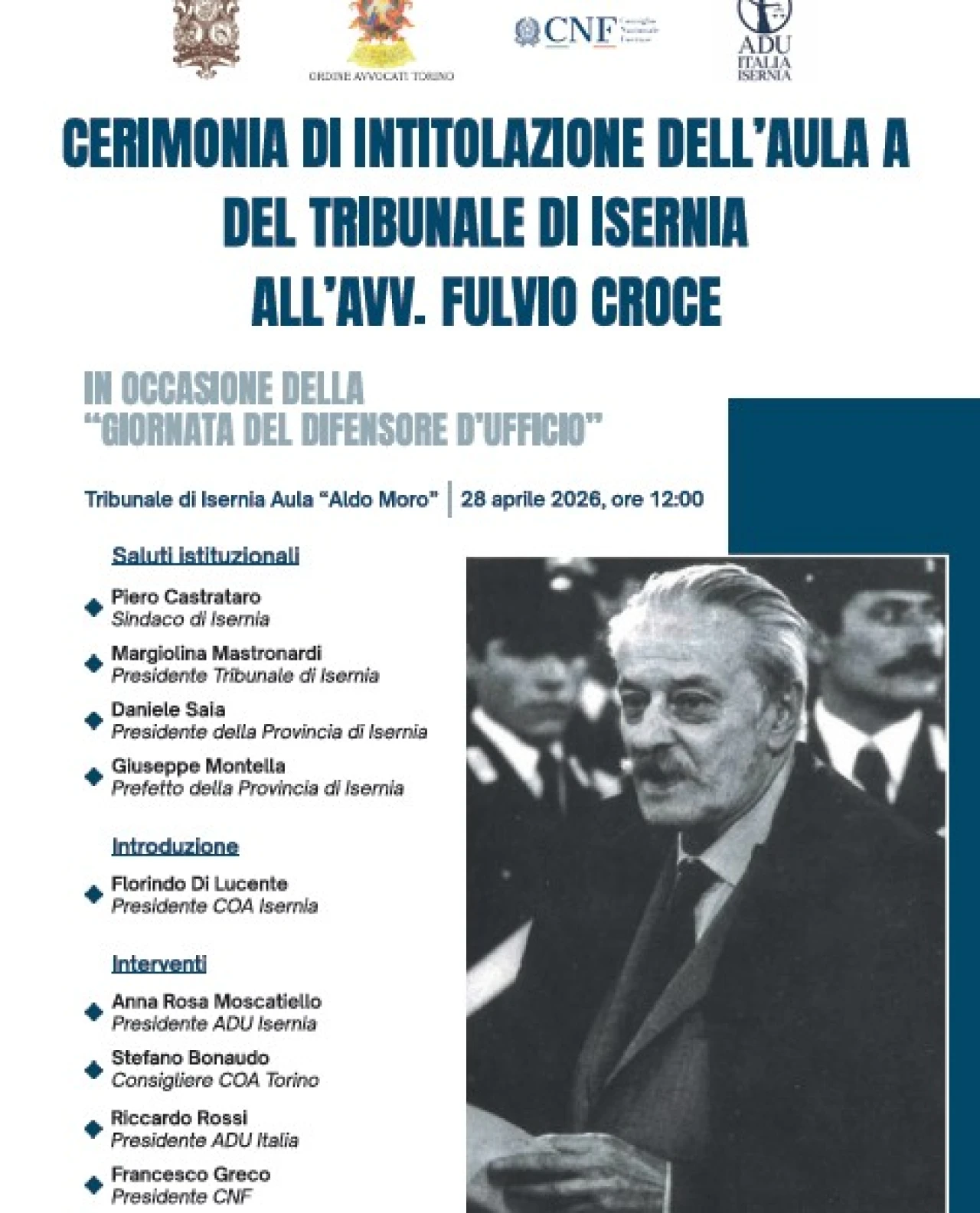 Fulvio Croce, Presidente dell’Ordine degli Avvocati di Torino, dimostrando un profondo senso dello Stato, assunse la difesa d’Ufficio dei brigatisti che rifiutavano la difesa tecnica per impedire la celebrazione del processo, rivolgendo minacce di morte a chiunque avesse deciso di assumere tale incarico con conseguente rinuncia dei designati. Il prossimo 28 aprile, in occasione di tale ricorrenza, il Consiglio dell’Ordine degli Avvocati di Isernia, in collaborazione con ADU Italia e con la sezione locale dell’associazione, si è fatto promotore dell’iniziativa di intitolare l’aula “A” del Palazzo di Giustizia alla memoria dell’Avv. Croce, volendo in tal modo dare il giusto rilievo ad una figura che simboleggia l’Avvocatura tutta, esaltando quei princìpi di dedizione e di fede al giuramento prestato che rendono la professione forense un presidio di legalità. Alla cerimonia, in rappresentanza di tutta l’Avvocatura italiana, sarà presente l’Avv. Francesco Greco, Presidente del Consiglio Nazionale Forense.