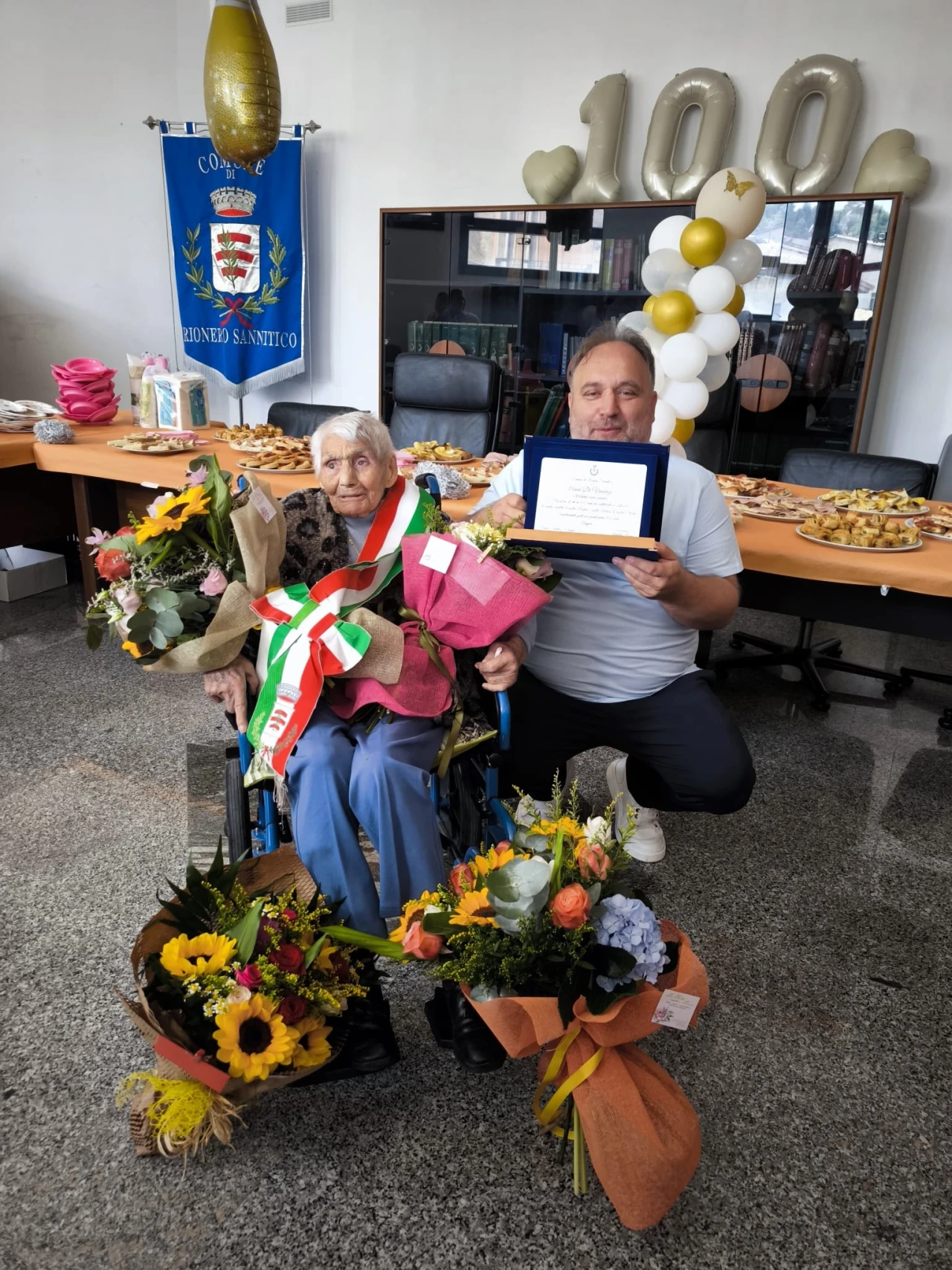RIONERO SANNITICO. Una giornata di festa che i suoi familiari le hanno voluto dedicare. Anna Di Vincenzo di Rionero Sannitico, ha festeggiato quest’oggi il suo centesimo compleanno. Si tratta della seconda nonnina del territorio comunale che taglia questo importantissimo traguardo. Per lei una mega festa di paese. Prima la celebrazione della Santa Messa e subito dopo il rinfresco in piazza all’interno di un locale adiacente la sede del Municipio di Rionero Sannitico. Il sindaco Arnaldo Rossi, per l’occasione, ha consegnato a nonna Anna la fascia di primo cittadino e una targa commemorativa della giornata, trasformando cosi l’anziana piu’ longeva di Rionero nel sindaco per un giorno. GUARDA IL SERVIZIO.