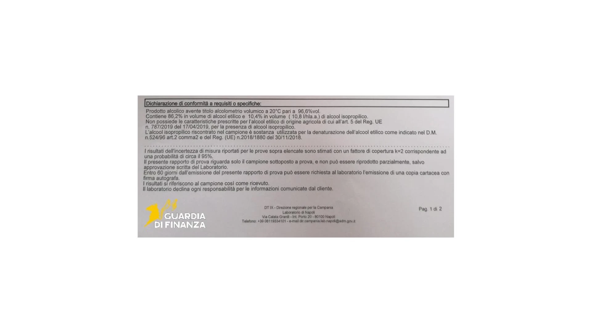 Le analisi chimiche del prodotto sequestrato hanno ora svelato la presenza, nel campione esaminato dal laboratorio dell'Agenzia delle Dogane e dei Monopoli di Napoli, di alcool isopropilico, in percentuale tra il 9,7 e il 10,4, composto che viene normalmente utilizzato per usi industriali, medici e cosmetici, e che comporta gravi rischi per la salute in caso di ingestione.Il suggerimento della GdiF, pertanto, è di acquistare solo da rivenditori autorizzati e diffidare di offerte troppo convenienti o prodotti di dubbia provenienza.Per il principio di presunzione di innocenza, la responsabilità degli indagati sarà definitivamente accertata solo nel caso in cui intervenga una sentenza irrevocabile di condanna.L’attività di servizio testimonia il costante impegno della Guardia di finanza nel contrasto ai traffici illeciti a tutela, oltre che dell’erario e dell’economia sana, anche della salute e dei diritti dei consumatori.