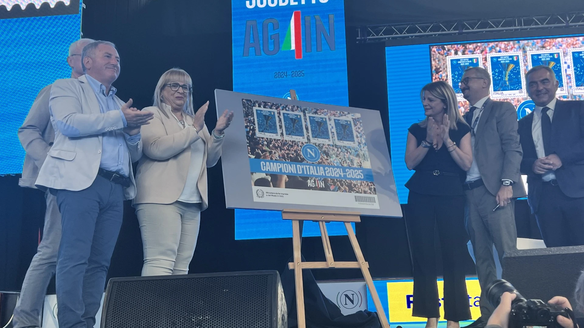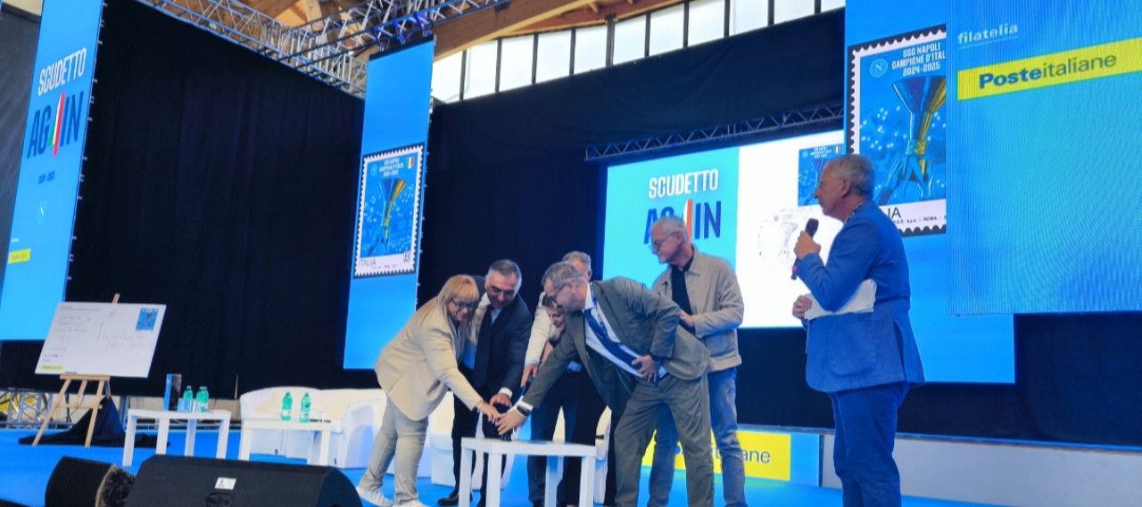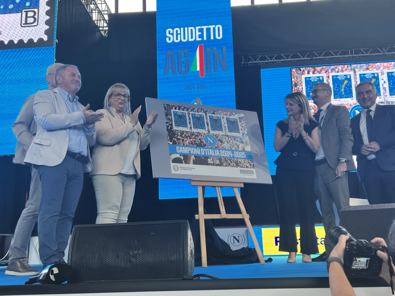 CASTEL DI SANGRO - Il Napoli campione d’Italia 2024/2025 entra nella storia postale italiana: al Palasport di Castel di Sangro è stato presentato oggi il francobollo dedicato alla squadra vincitrice dello scudetto. L’iniziativa di Poste Italiane si è svolta nell’ambito del ritiro pre-campionato della formazione partenopea, che per il sesto anno consecutivo ha scelto la località abruzzese come sede della preparazione estiva.