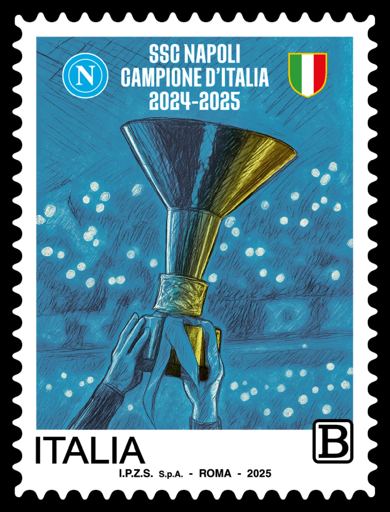 Completano il francobollo le leggende “SSC NAPOLI CAMPIONE D’ITALIA” e “2024-2025”, la scritta “ITALIA” e l’indicazione tariffaria “B”.