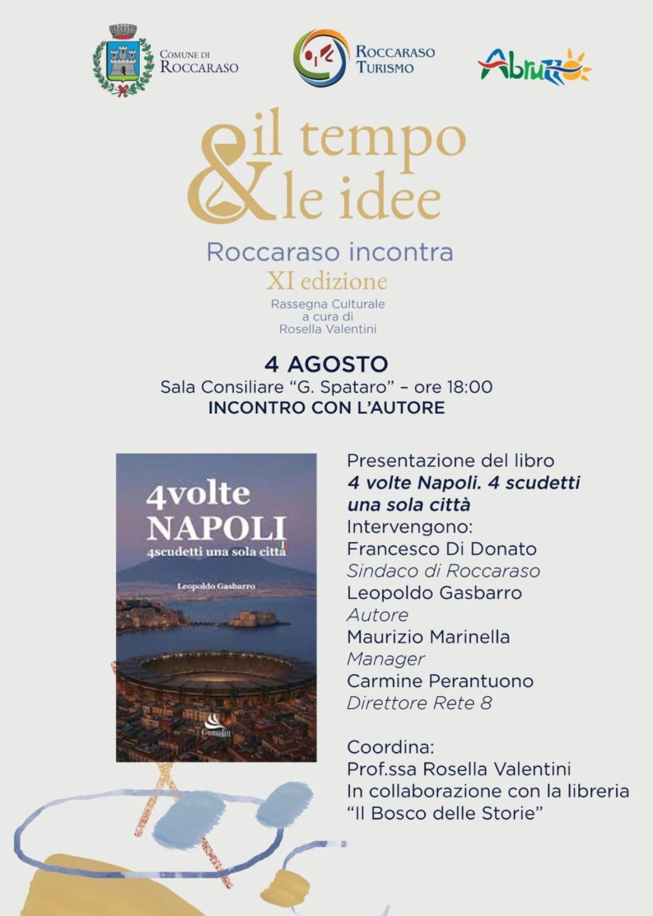 ROCCARASO. Appuntamento culturale da non perdere questa sera nella cittadina abruzzese. Alle ore 18 all'interno della sala consiliare comunale si svolgerà l'incontro con Leopoldo Gasbarro, autore del libro dal titolo "4volte Napoli, e scudetti una sola citta' ". Tanti gli ospiti di rilievo tra cui Maurizio Marinella manager, le cui cravatte sono tra le piu' famose al Mondo e Carmine Pera tuono, direttore Rete8. Coordina l'incontro la professoressa Rosella Valentini.