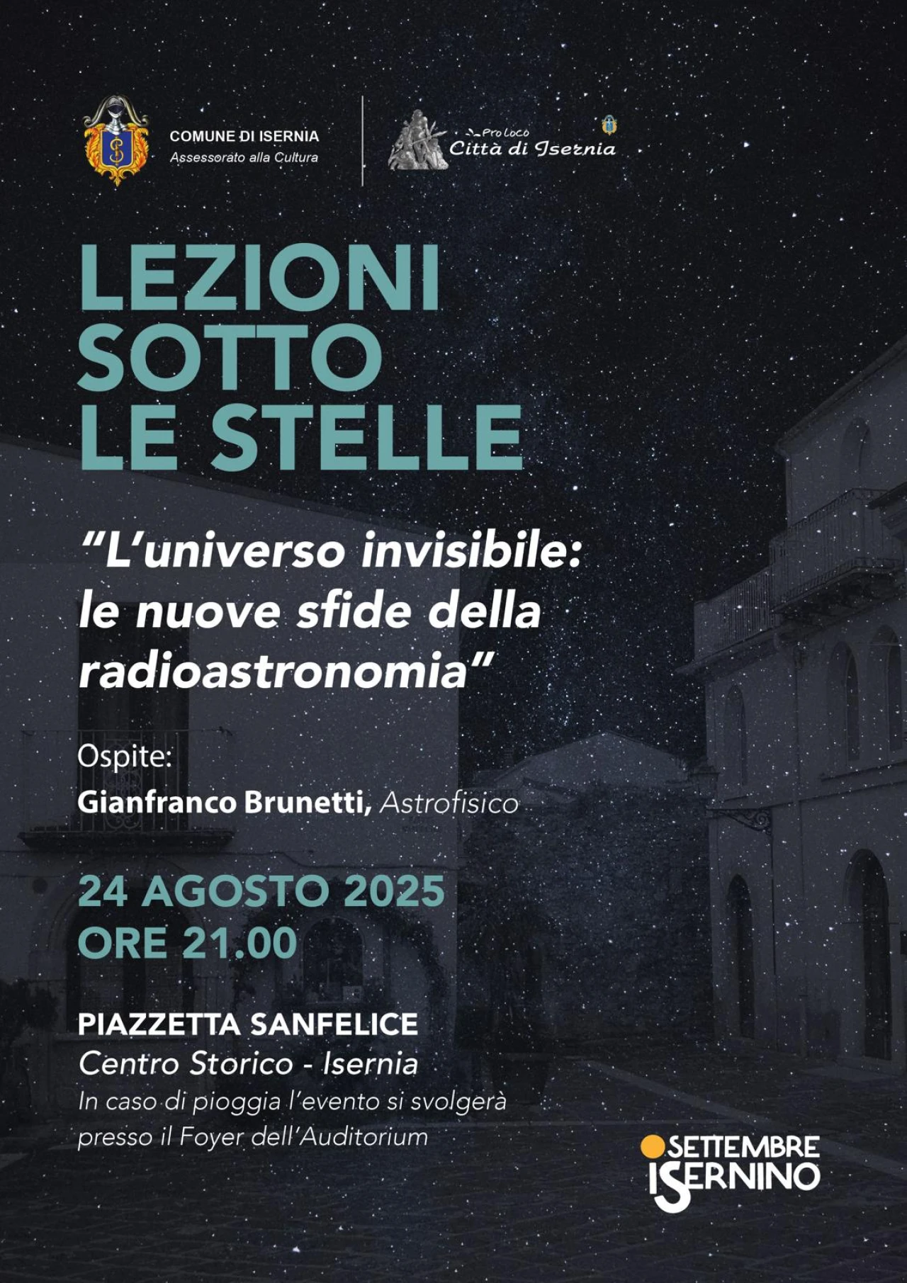 ISERNIA. Domenica 24 agosto, alle ore 21.00, torna in piazzetta Sanfelice “Lezioni sotto le Stelle”, iniziativa promossa dal Comune e dalla Pro Loco Città di Isernia, giunta quest’anno alla sua terza edizione. Come da tradizione, l’appuntamento vede protagonista un figlio della nostra terra che, grazie al proprio impegno, si è distinto nel contesto professionale e culturale. Ospite dell’edizione 2025 sarà l’astrofisico Gianfranco Brunetti, che terrà una lezione aperta al pubblico sulla radioastronomia e sulle sue frontiere. In particolare, si parlerà di VLBI + EHT, LOFAR e SKA, i più importanti radiotelescopi del mondo, strumenti che stanno rivoluzionando la conoscenza dell’universo.