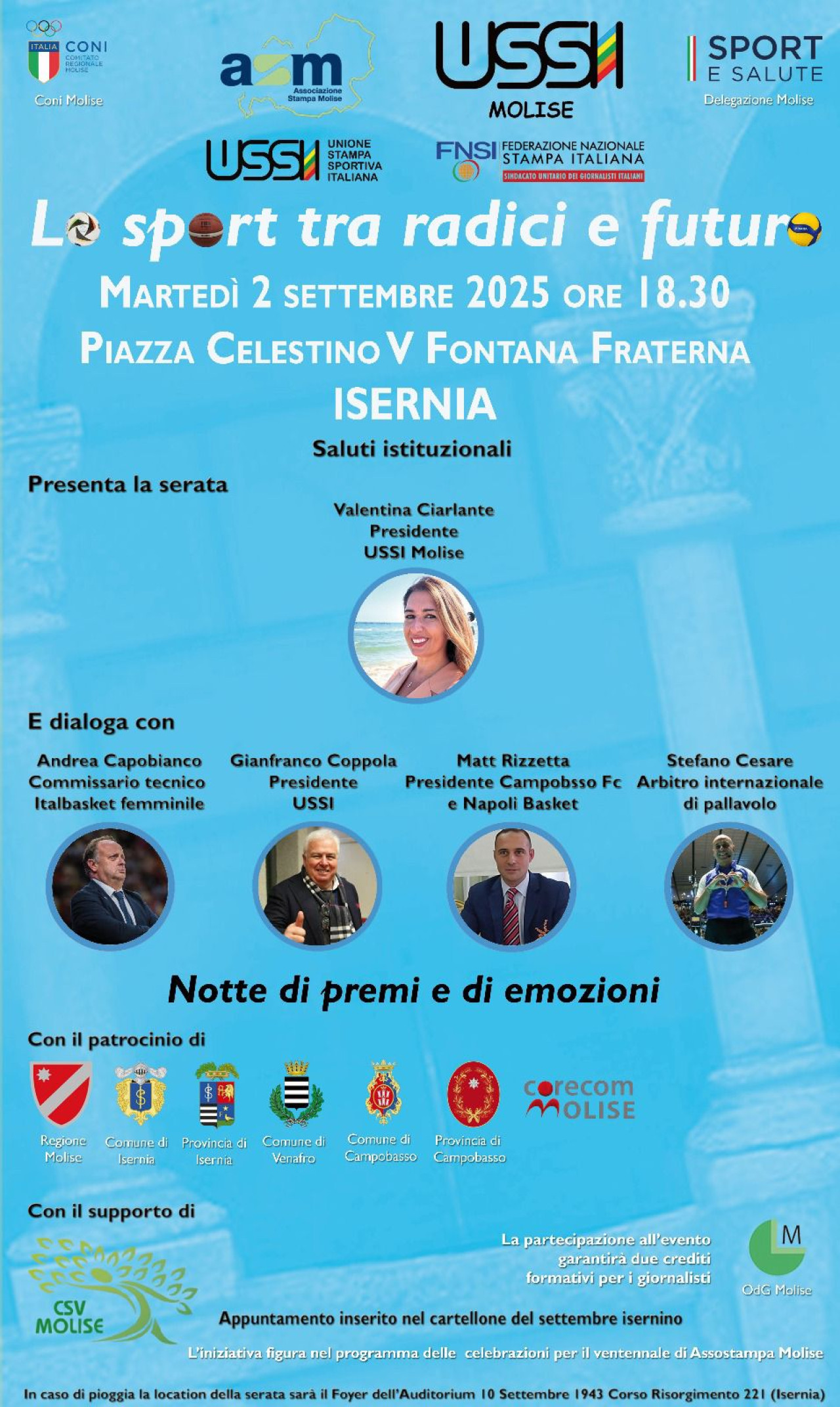 «Grazie alla presenza di autorevoli protagonisti del mondo del calcio, del volley, della pallacanestro e dell’informazione realizzeremo un ponte ideale tra passato e futuro, passando per il presente, con un focus sull’aspetto manageriale dello sport, legato alla comunicazione - l’anticipazione della presidente USSI Valentina Ciarlante -. Il tema centrale sarà il racconto giornalistico, elemento fondamentale e fonte di arricchimento per lo sport stesso, in tutte le sue accezioni. Ringrazio il presidente nazionale Gianfranco Coppola, sempre attento alle tematiche territoriali e disponibile a offrirci il suo prezioso contributo, il presidente della Conferenza nazionale dei presidenti dei gruppi USSI Mario Zaccaria che parteciperà con entusiasmo, tutti gli ospiti, gli sportivi e le autorità che interverranno. Allo stesso modo rivolgo un ringraziamento per il supporto al vicepresidente Mauro Carafa, al direttivo dell’associazione e al consigliere nazionale del Molise Antonio Fatica, agli iscritti, ad Assostampa e al presidente Giuseppe Di Pietro, oltre che a tutti gli enti che hanno apprezzato da subito i contenuti della serata. Un grazie particolare quindi per il patrocinio alla Federazione nazionale della stampa e alla sua segretaria Alessandra Costante, alla Consigliera nazionale del CONI Elisabetta Lancellotta, al CONI Molise, a Sport e Salute, al Comune di Isernia, alla Regione Molise, al CSV Molise, al Comune di Campobasso, al Comune di Venafro, alla Provincia di Isernia, alla Provincia di Campobasso, all’Ordine dei Giornalisti del Molise, al Corecom (Comitato regionale per le comunicazioni). Invito tutti a raggiungerci martedì in piazza Celestino V a Isernia, per una serata da vivere insieme, nel segno dello sport».