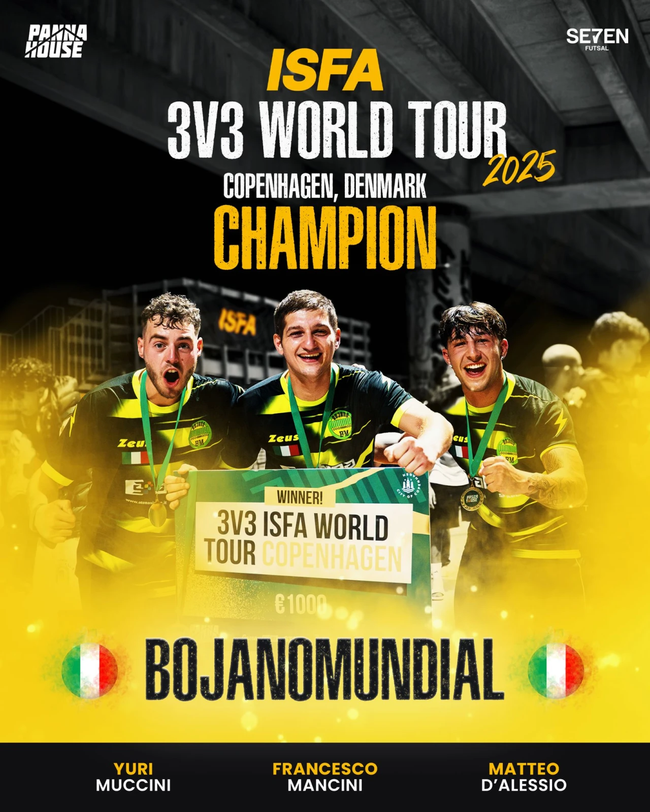 Lo scorso weekend il BojanoMundial ha preso parte al prestigioso torneo di Street Football 3v3 dell’ISFA World Tour 2025, andato in scena a Copenaghen. La formazione molisana ha schierato Francesco Mancini e Matteo D’Alessio di Colli a Volturno, insieme a Yuri Muccini di Campobasso. Il giorno precedente al torneo, i giocatori hanno assistito al decennale del Panna World Championship, storico evento 1v1 organizzato dai Pannahouse. L’edizione ha visto il trionfo del marocchino Mehdi Amri, star da oltre tre milioni di follower, che in finale ha superato il danese Noah Kofi. Il torneo 3v3 ha visto la partecipazione di 24 squadre divise in 6 gironi. Il BojanoMundial ha esordito con un pareggio per 2-2 contro i tedeschi di Speedy, per poi vincere 2-1 grazie alla doppietta di Mancini contro Egregor. La vittoria decisiva per il primo posto nel girone è arrivata contro i newyorkesi di Tal3nto, battuti 2-0.