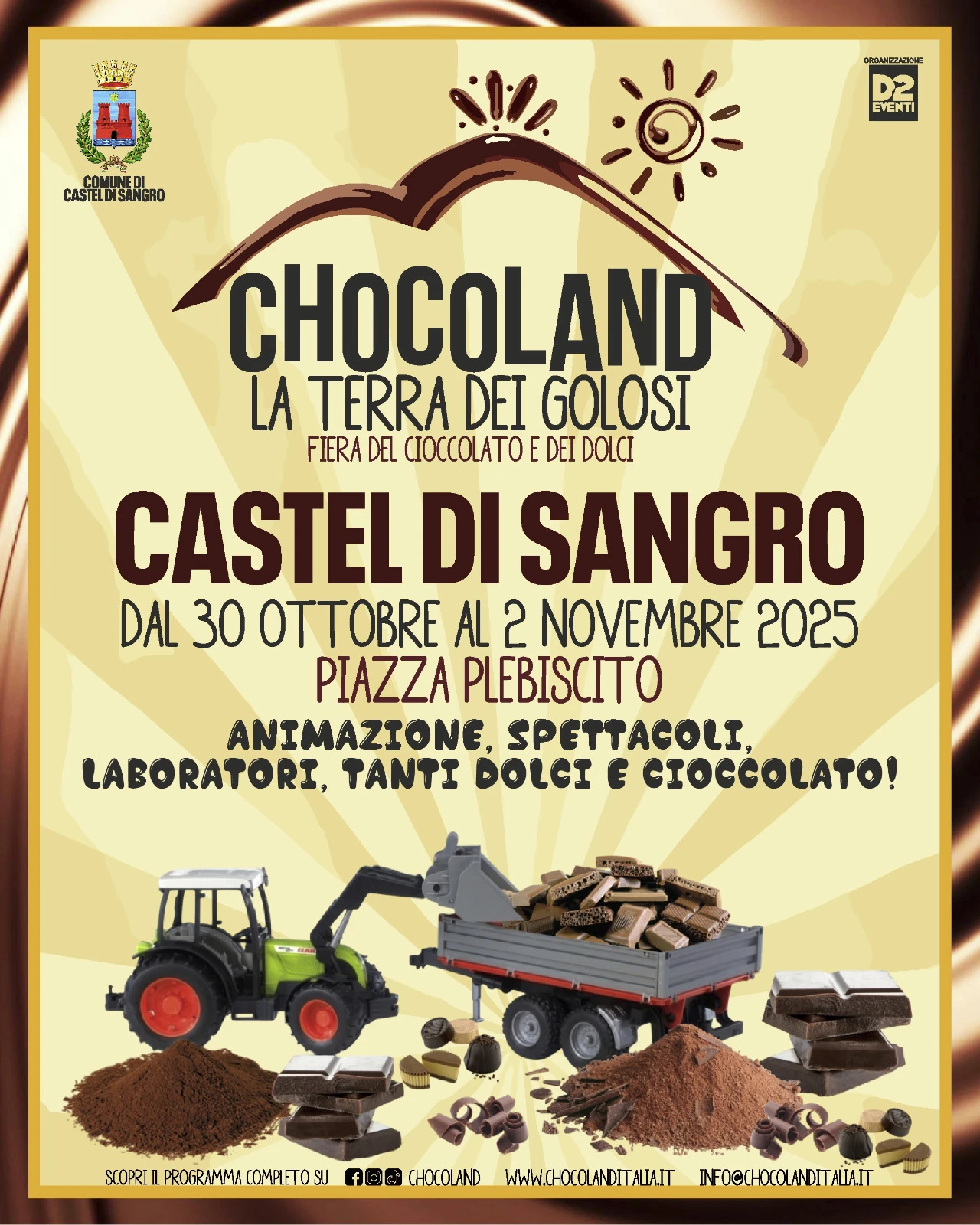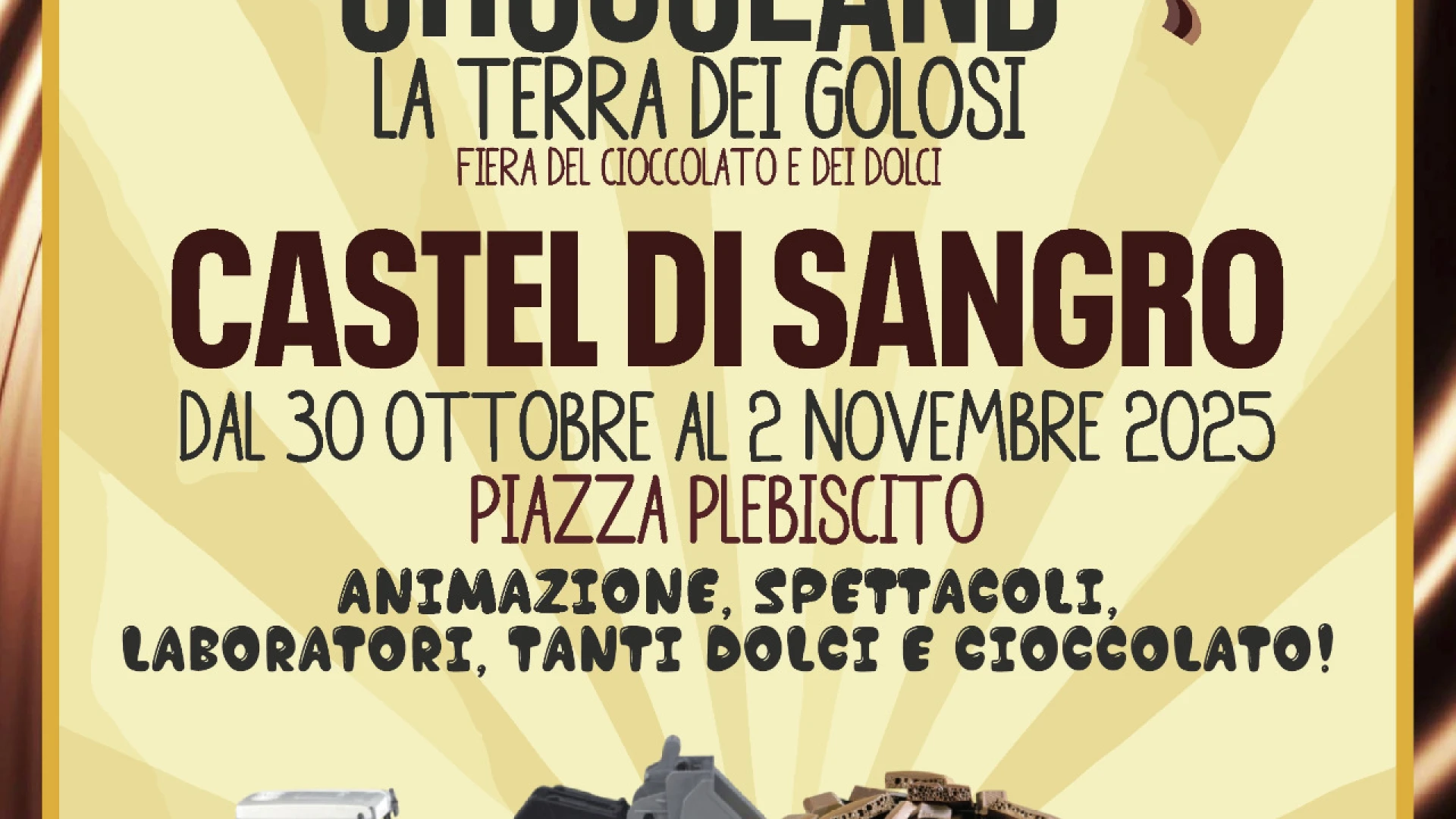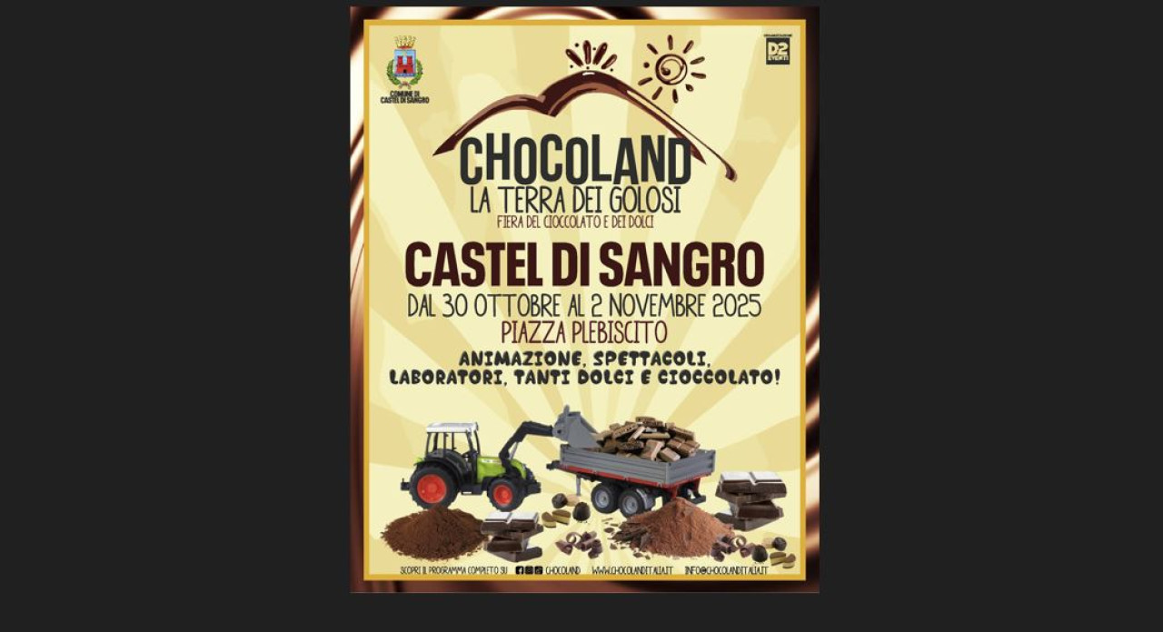 CASTEL DI SANGRO. Un appuntamento assolutamente da non perdere. A Castel Di Sangro grazie all’organizzazione della D2 EVENTI dal 30 ottobre al 2 novembre la prima edizione di Chocoland La Terra dei Golosi. Evento patrocinato dal comune di Castel Di Sangro. In Piazza Plebiscito spazio ad una vera e propria fiera del cioccolato e dei dolci. Tante le sorprese soprattutto per i più piccoli. Animazione, spettacoli, laboratori, tanti dolci e cioccolato per tutti. Il programma ufficiale dell’evento si conoscerà nei prossimi giorni. Intanto, l’organizzazione ha gia’ promosso un video promo per pubblicizzare la manifestazione.