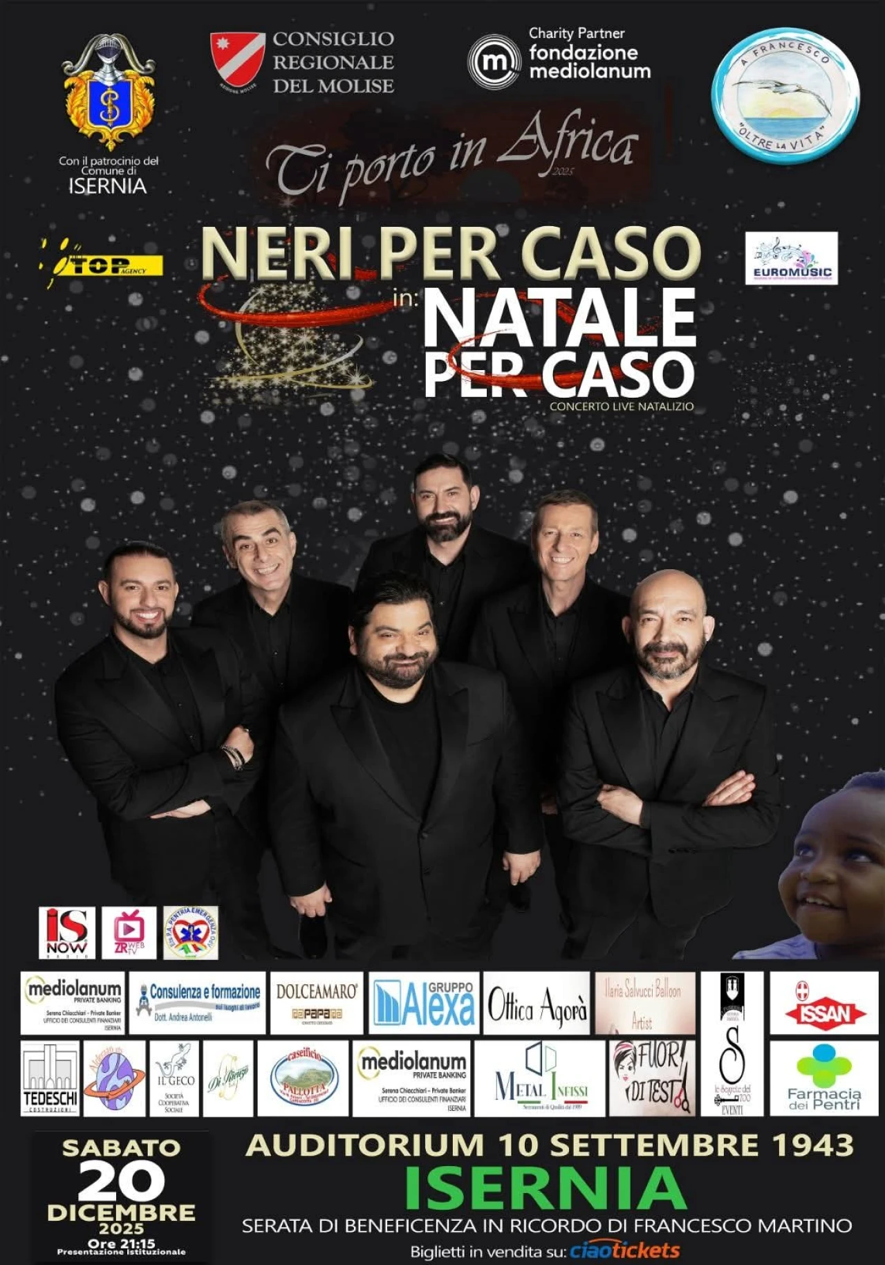 Sabato 20 dicembre ore 21 all'Auditorium 10 settembre 1943 l’associazione Oltre la Vita organizza l’evento benefico con degli ospiti d’eccezione: i Neri per Caso. Il noto gruppo vocale si esibirà con lo spettacolo ‘Natale per caso’ e il ricavato sarà utilizzato per finanziare il progetto di ricostruzione di un villaggio nella provincia di Rutana, in Burundi.