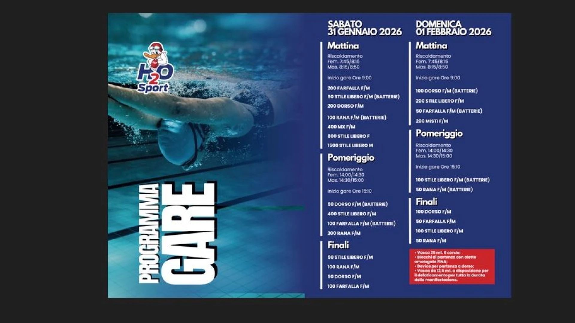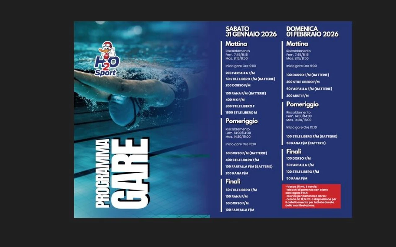 Si partirà sabato mattina con in vasca gli atleti e le atlete impegnati nelle batterie dei 200 farfalla, 50 stile, 200 dorso, 100 rana, 400 misti, 800 stile, 1500 stile. Nel pomeriggio spazio per i 50 dorso, 400 stile, 100 farfalla e 200 rana. A seguire ci saranno le finali dei 50 stile, 100 rana, 50 dorso e 100 farfalla. Domenica mattina a partire dalle ore 9 sono in programma le batterie dei 100 dorso, 200 stile, 50 farfalla e 200 misti. Nel pomeriggio si tornerà in vasca per andare all’assalto delle finali nei 100 stile e 50 rana. Poi ci saranno le finali dei 100 dorso, 50 farfalla, 100 stile e 50 rana.