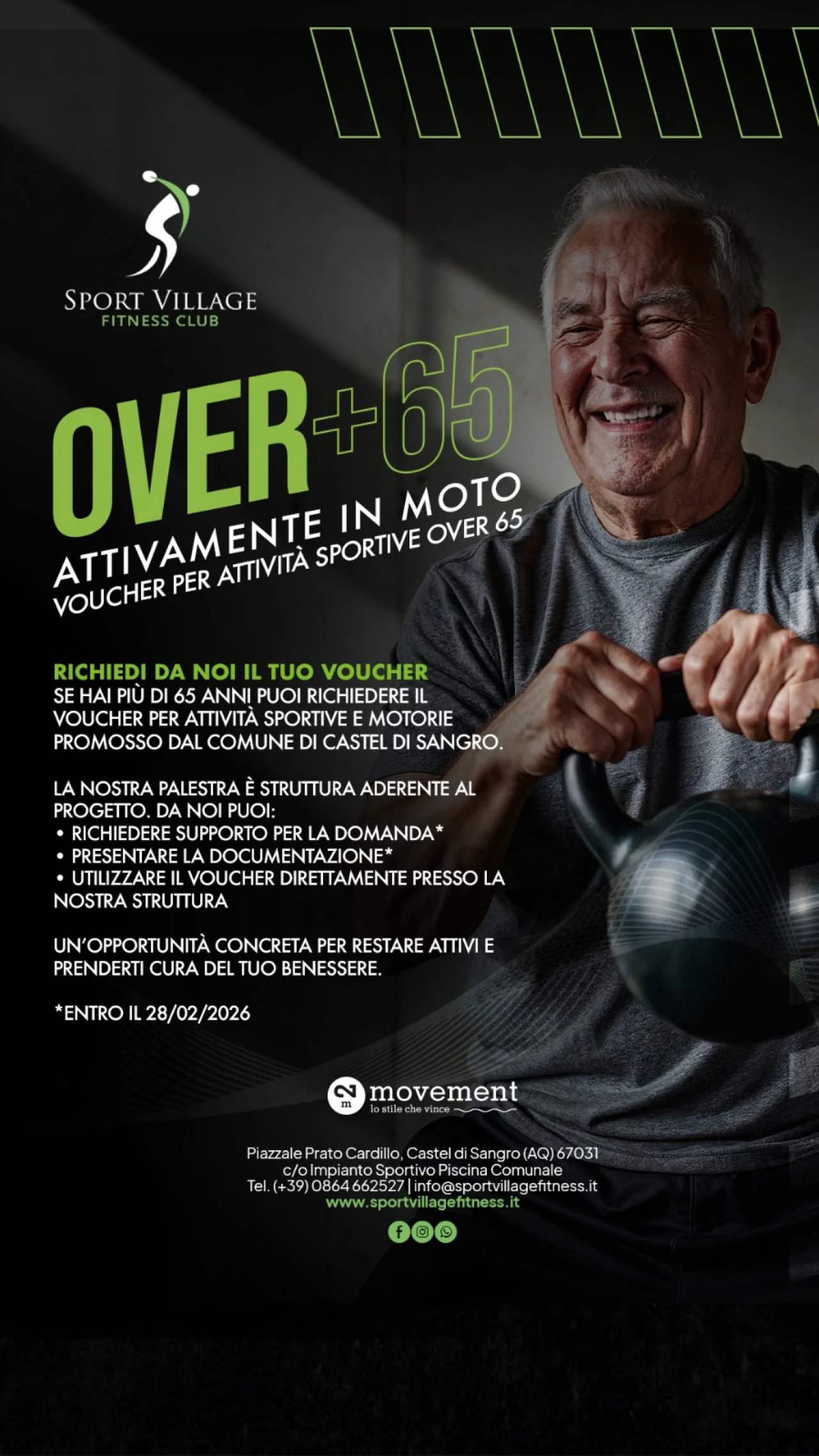 REDAZIONALE / CASTEL DI SANGRO-AQ. Presso la palestra Sport Village Fitness Club in Piazzale Prato Cardillo nuova ed importante iniziativa dedicata al movimento e soprattutto alla pratica sportiva da svolgere in terza età. Entro il 28 febbraio 2026 gli interessati potranno aderire al progetto OVER+65 Attivamente in moto che consente l’attivazione di un voucher per attività sportive over 65. Il voucher puo’ essere richiesto se hai piu’ di 65 anni. Lo strumento concederà diritto alla pratica in struttura di attività sportive e motorie. Sport Village Fitness Club aderente al progetto offrirà: