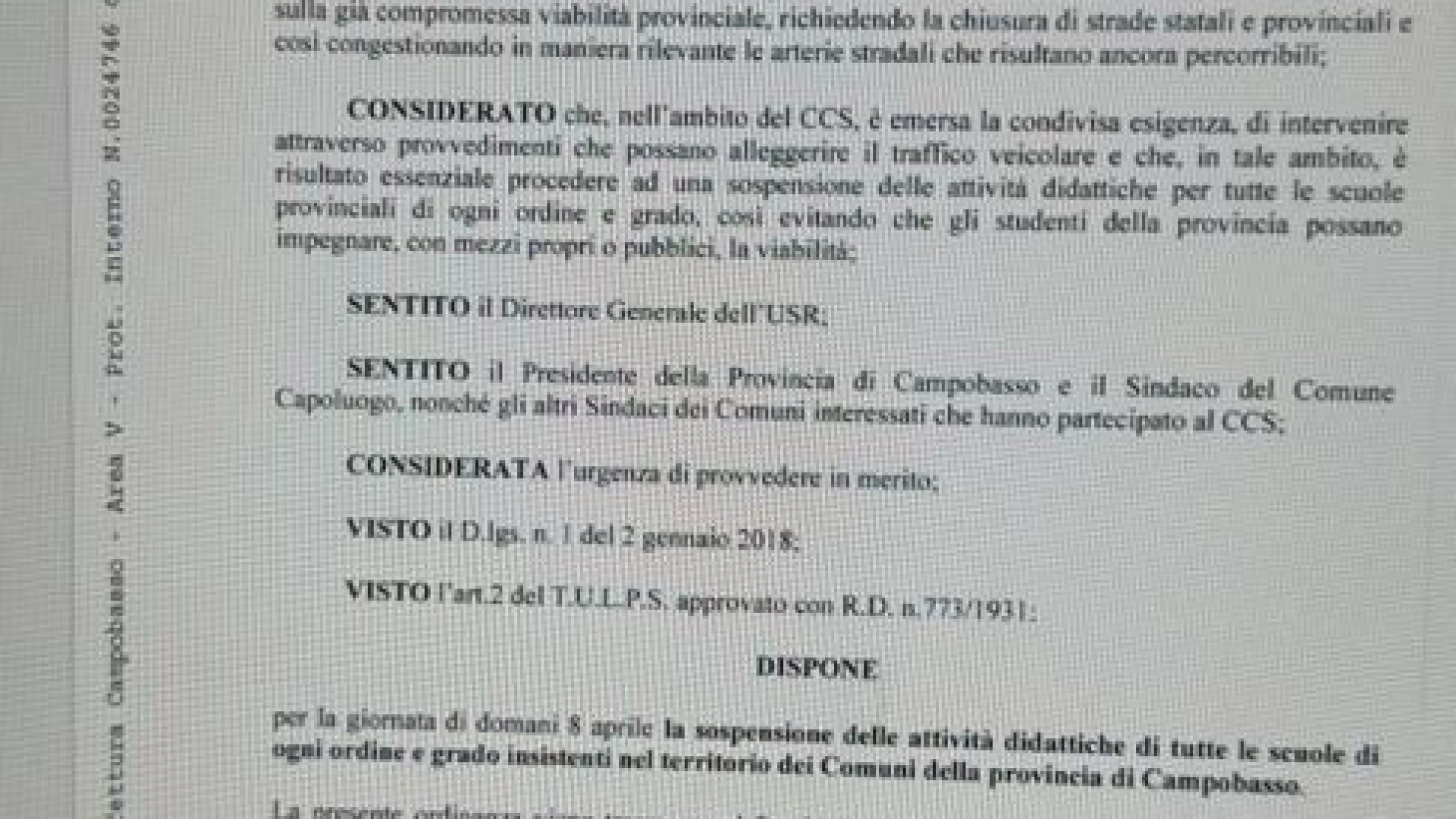 IL DOCUMENTO UFFICIALE DELLA PREFETTURA DI CAMPOBASSO: